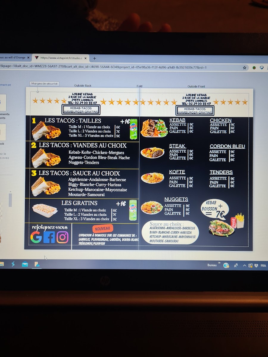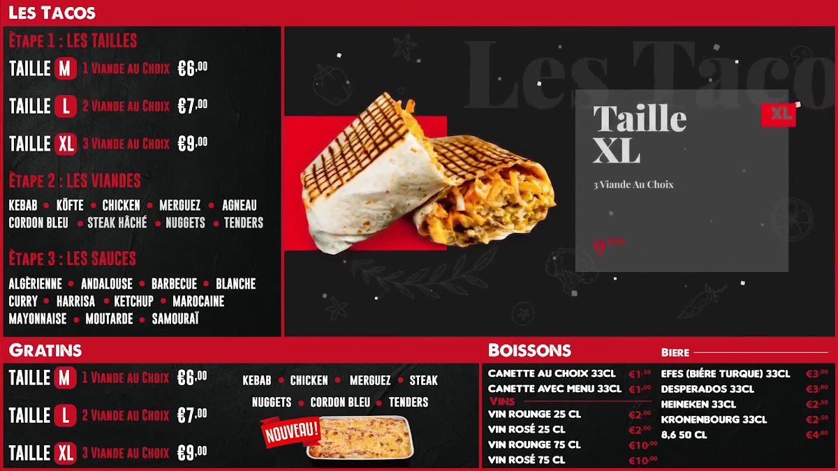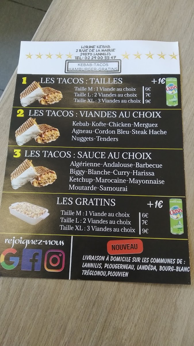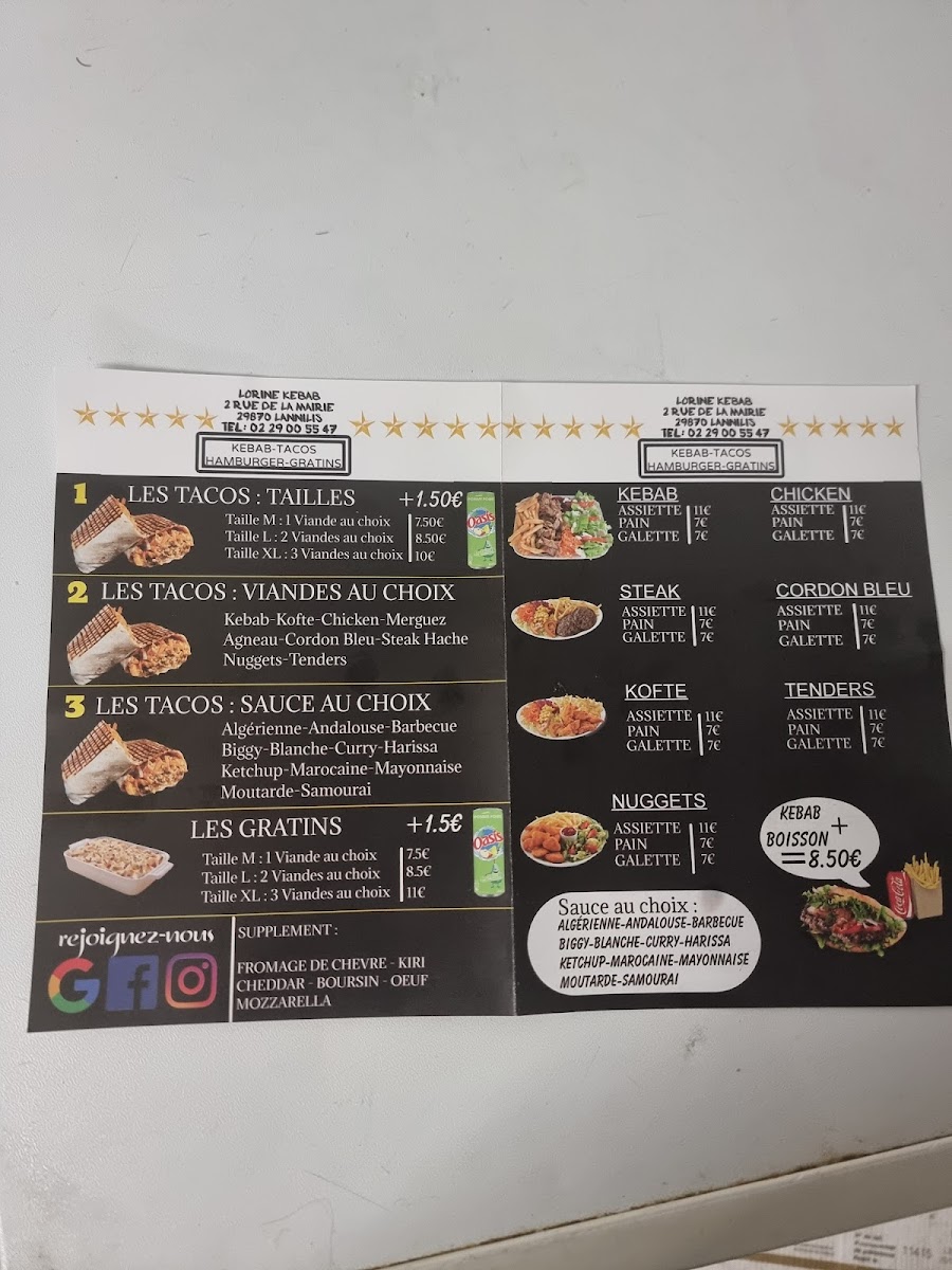 The menu at Lorine Kebab offers a flavorful journey into classic kebab and fast food dishes, with a variety of options for every taste. The standout dishes include the Assiette Kebab, a generous plate filled with tender, seasoned meat served with fresh salad and crispy fries-perfect for those looking for a hearty meal. Another favorite is Les Tacos, a delightful combination of meat, cheese, and various fillings, all wrapped in a soft tortilla, making it a satisfying option for taco lovers. Whether you're in the mood for a quick snack or a fulfilling meal, Lorine Kebab's offerings ensure that every visit is a satisfying experience, with great value for money.